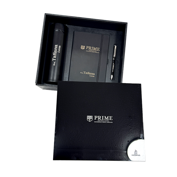 El contenido incluye artículos como esferos, agendas, termos y otros accesorios, todos marcados en láser para garantizar un acabado profesional y duradero. Además, podemos personalizar la selección de productos dentro de la caja según los requerimientos del cliente, logrando un detalle corporativo exclusivo que transmite prestigio y gratitud.